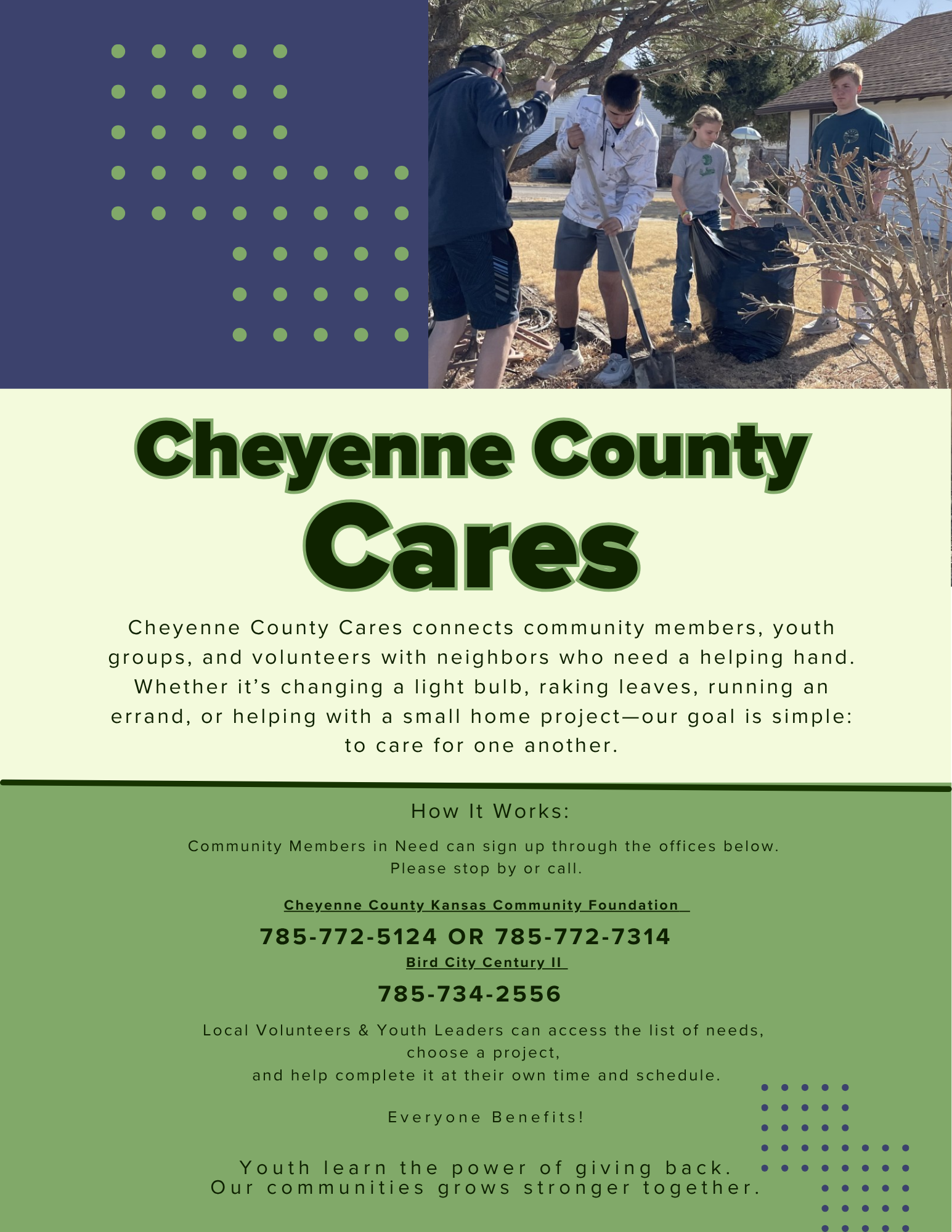 Read more >>Cheyenne County Cares: Connecting Youth with Neighbors in Need The Cheyenne County Kansas Community Foundation (CCKCF), an affiliate of the Greater Northwest Kansas Community Foundation, is proud to introduce Cheyenne County Cares — a community-based program designed to connect youth volunteers with residents who could use a helping hand. A Vision of Caring and Connection Cheyenne County Cares was created with a simple but powerful goal: to strengthen community ties through acts of service. The program engages local youth in assisting individuals and families who may need help with everyday tasks — from yardwork and small household projects to running errands or providing companionship. “Our vision is to show that caring for others is part of what makes Cheyenne County strong,” said Jessica Matthies, Executive Director of CCKCF. “This program gives students the opportunity to serve, learn empathy, and see the real difference they can make in someone’s day.” How It Works Residents with a need can simply call or visit either the Cheyenne County Kansas Community Foundation (CCKCF) office or Bird City Century II (BCCII) to sign up. After registration, a youth leader will gather a team of students and contact the individual to schedule a time to complete the requested task. By pairing motivated youth with community members who need assistance, Cheyenne County Cares creates a bridge between generations — fostering compassion, teamwork, and local pride. It’s a grassroots effort that highlights the best of small-town spirit: neighbors helping neighbors. Get Involved Those wishing to request assistance or learn more about volunteering can call or stop by: Cheyenne County Kansas Community Foundation 209 E. Washington St. (In the city building) St. Francis, KS 67756 (785)772-5124 or (785) 772-7314 Bird City Century II Development Foundation 107 W Bressler Bird City, KS 67731 (785) 734-2556